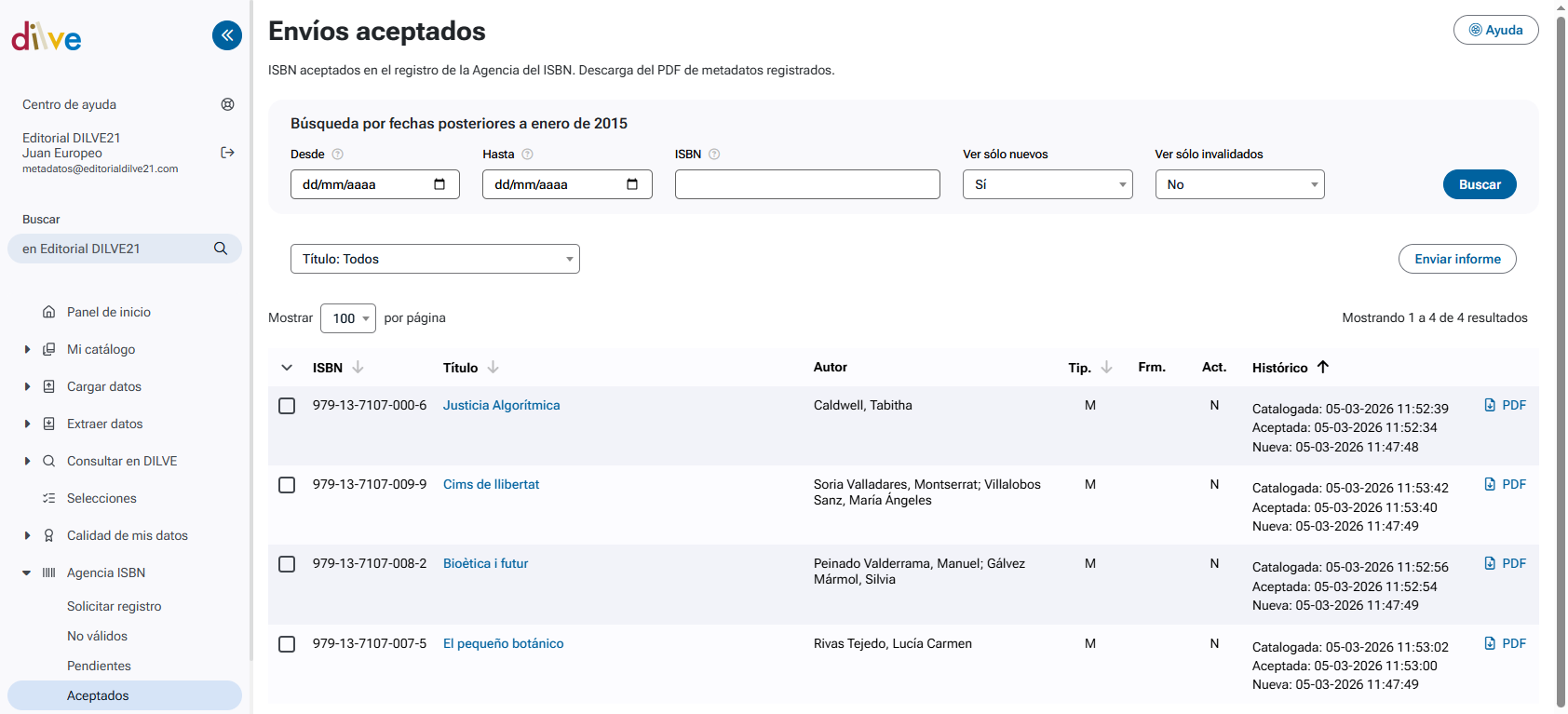 | Enviar informe | Descarga un informe actualizado con los ISBN del listado y su estado en el registro. En general tendrán estado A (Aceptado). |