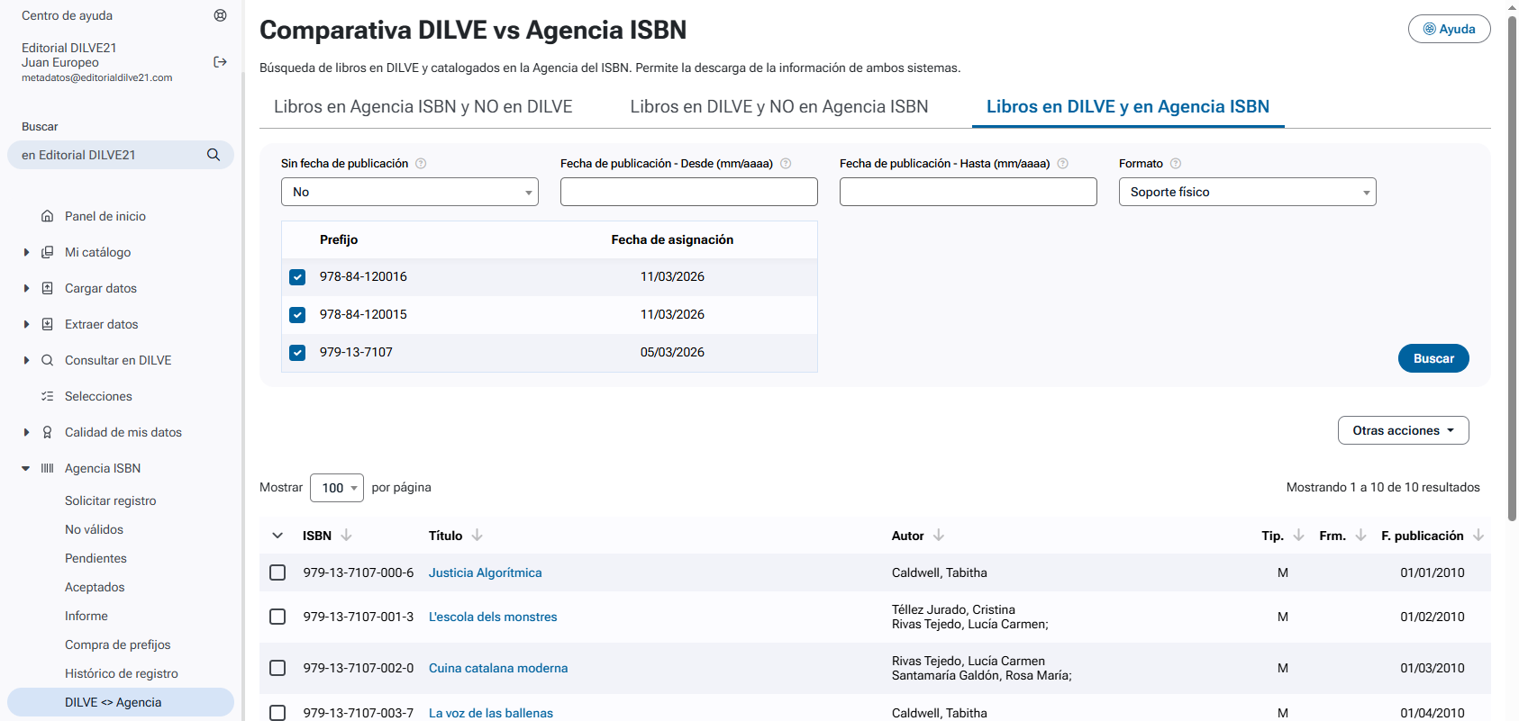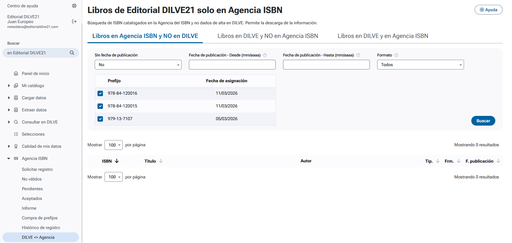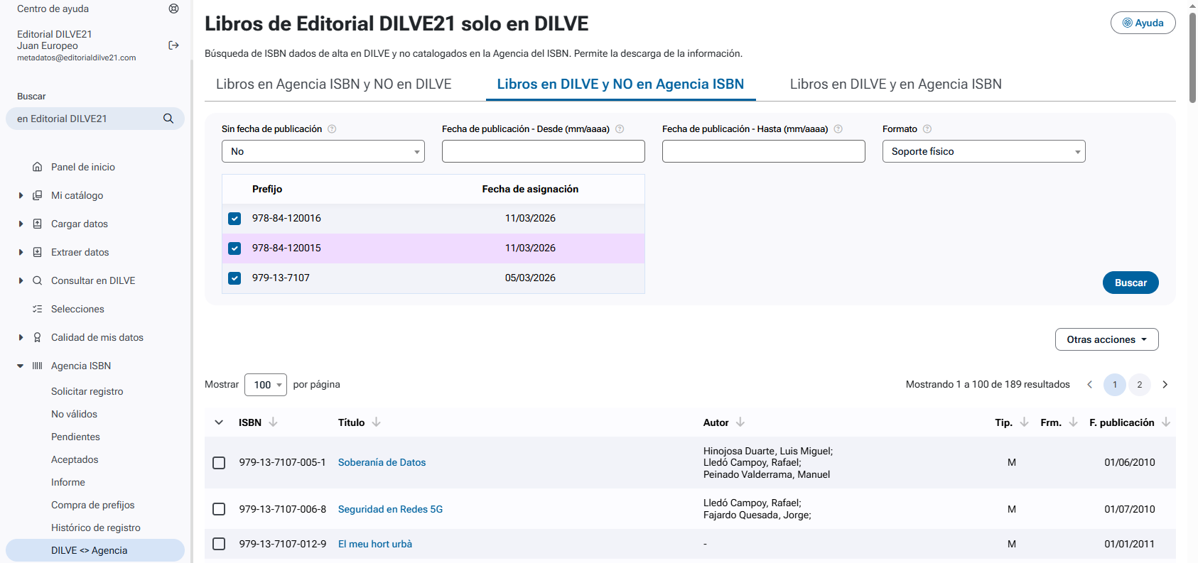 - Libros en Agencia ISBN y NO en DILVE: Para identificar libros catalogados en la Agencia del ISBN no dados de alta en DILVE y poder descargarlos para su posterior alta en DILVE.