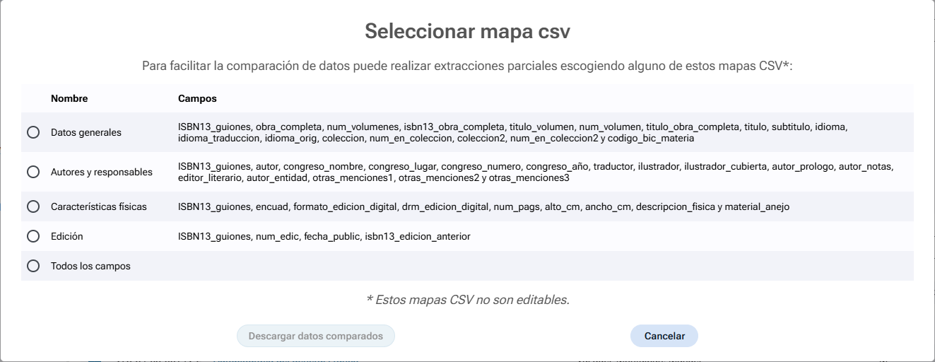 - Descargar: Permite descargar un archivo CSV con los datos básicos que figuran en DILVE de los libros seleccionados en el listado. Se ofrecen varios mapas CSV: