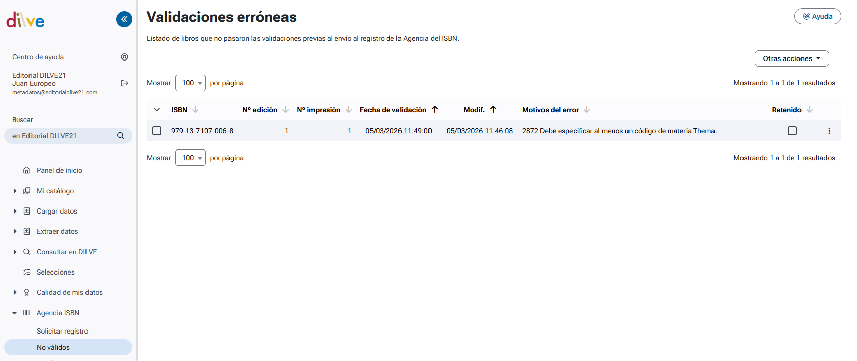 Permite consultar los registros de libros que no han superado las validaciones previas al envío al Registro de la Agencia del ISBN. El listado ofrece información sobre el libro, el motivo del error y la fecha del último intento de envío.