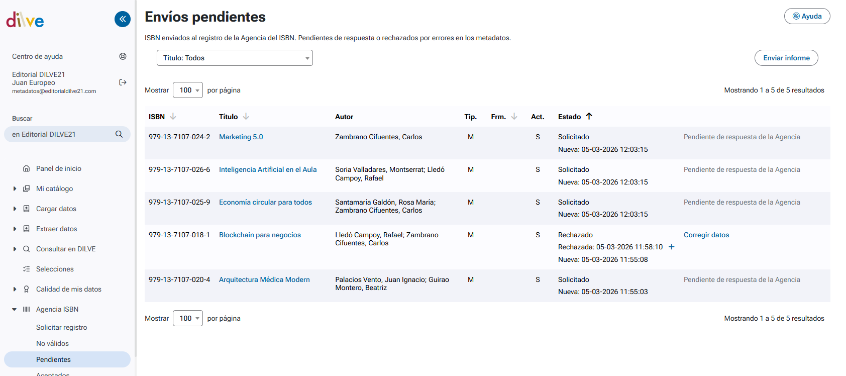 | Estado | Indica el estado del último envío al registro de la Agencia del ISBN: