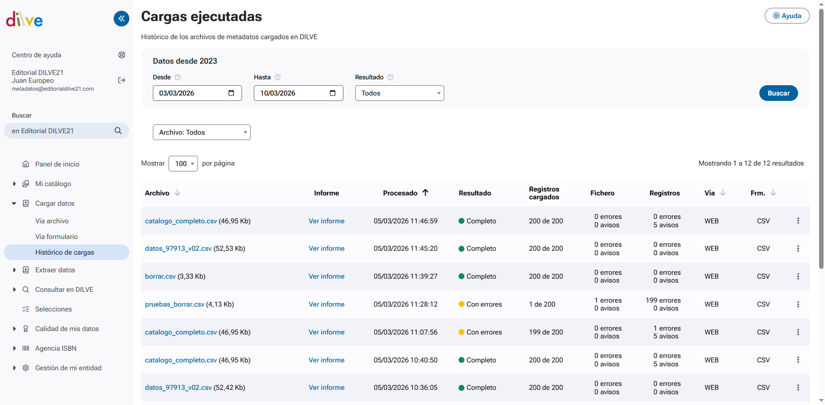 Permite consultar las cargas de archivos realizadas por el usuario conectado. Ofrece información sobre el nombre del archivo, el formato de éste, la fecha de ejecución, resultado de la carga, etc.