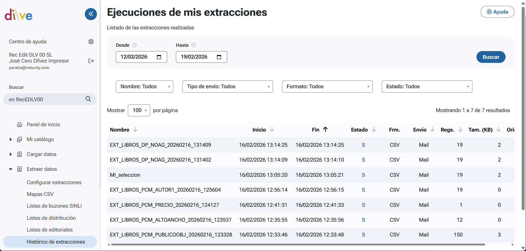 Permite consultar las ejecuciones de las extracciones del usuario conectado. Ofrece información sobre la fecha de ejecución, el nombre de la extracción, el número de registros exportados y el formato y método de envío.