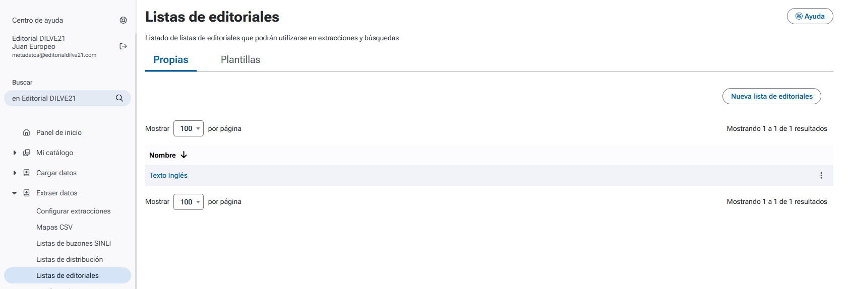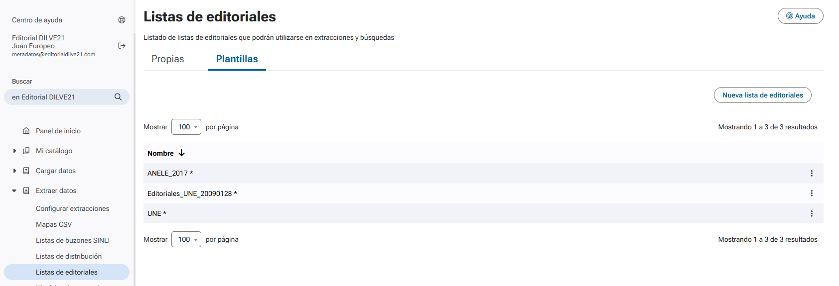 Es la pantalla inicial al entrar en la sección Listas de editoriales del menú Extraer datos.