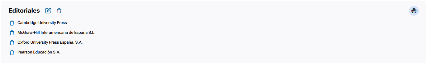 - El icono de eliminar (en la parte superior) permite eliminar todas las editoriales de la lista o cada una de las editoriales asignadas (en cada fila).