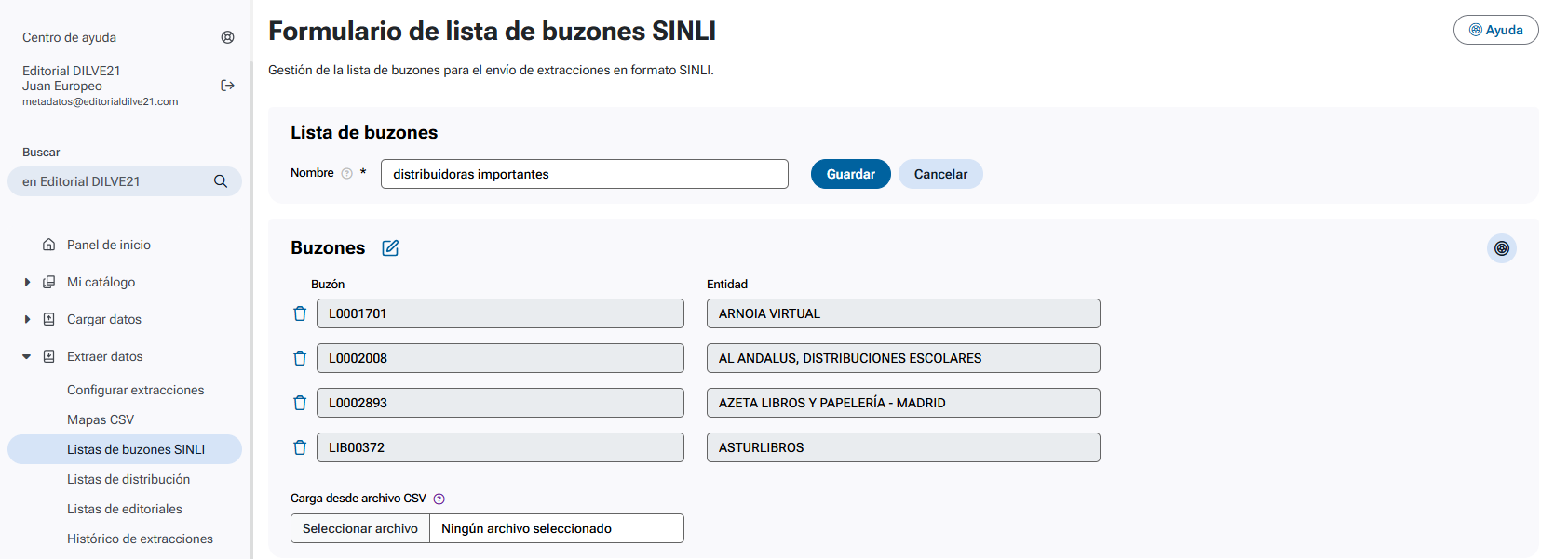 Permite cargar los buzones SINLI de la lista mediante un archivo CSV. El **CSV deberá tener 2 columnas: