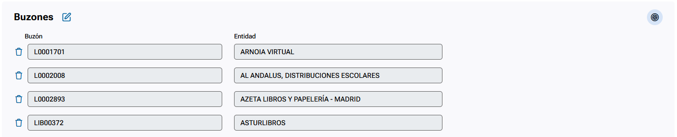 - El icono de eliminar buzón permite eliminar cada uno de los buzones asignados a la lista.