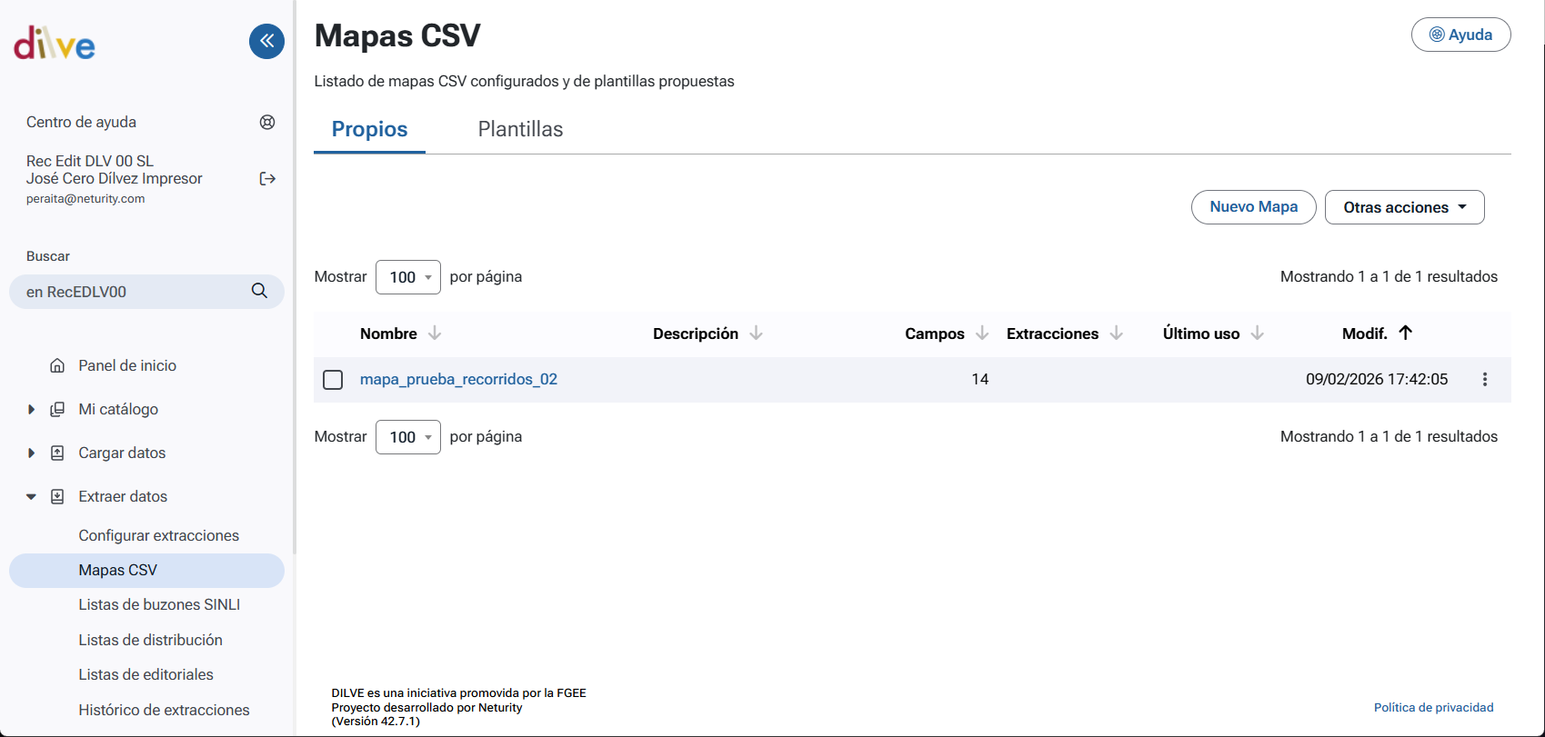 Desde esta pantalla se pueden crear nuevos mapas CSV, consultar o editar los mapas ya creados o eliminar los que ya no se necesiten. No podrán eliminarse los mapas CSV que estén siendo utilizados en alguna extracción.