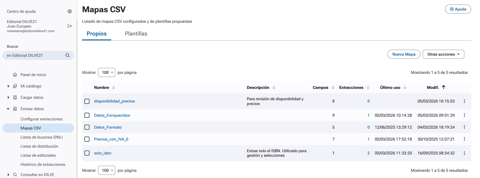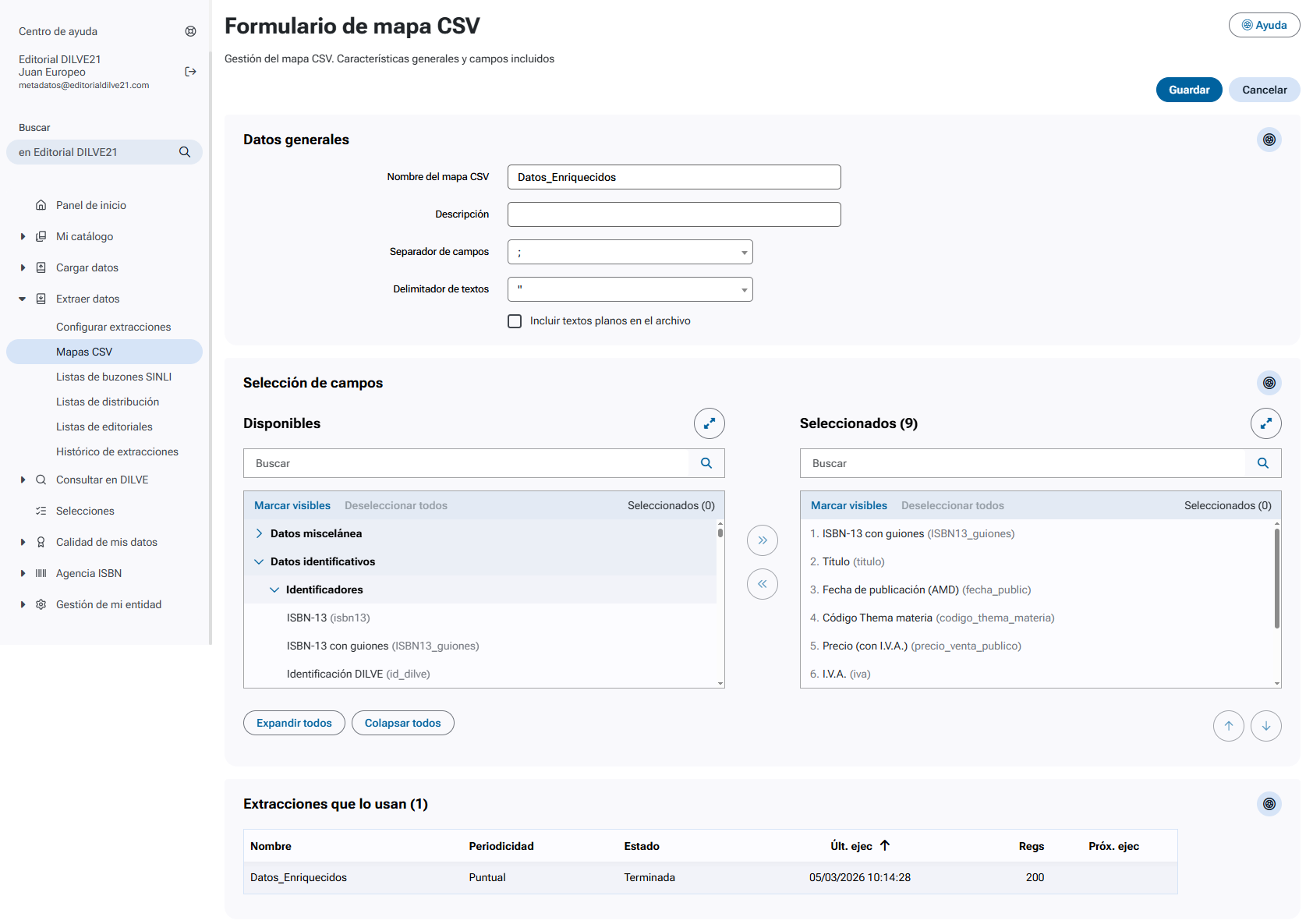 | Extracciones | Número de extracciones que utilizan el mapa CSV. |