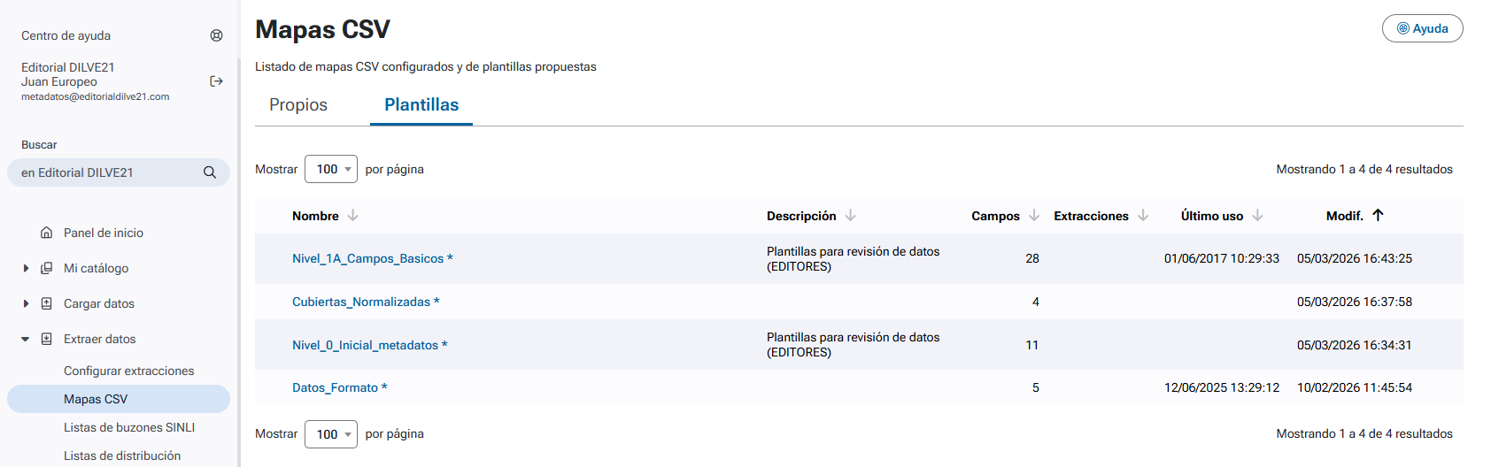 En la pestaña de Plantillas los administradores de DILVE proponen una serie de mapas CSV predefinidos, que se pueden utilizar como punto de partida para crear nuevos mapas propios.