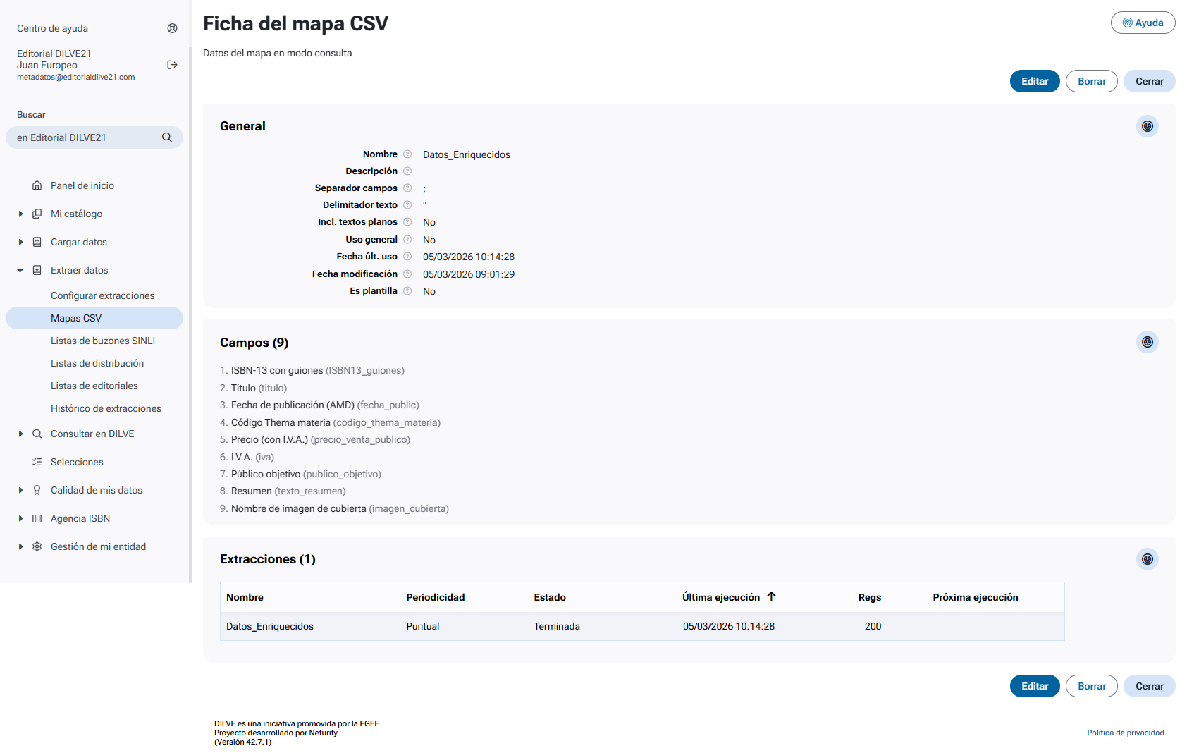 - Borrar: elimina el mapa CSV si no está siendo utilizado en ninguna extracción.