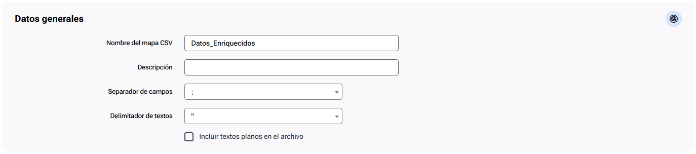 | Delimitador de campos | Carácter utilizado para delimitar los campos en el archivo CSV. Opcional |