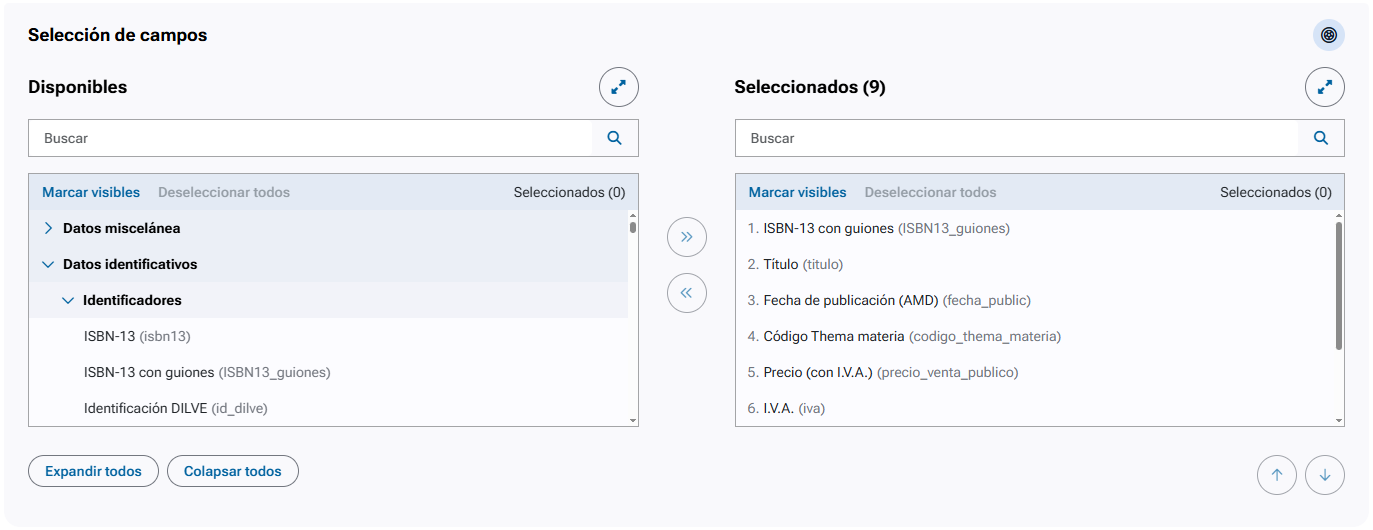 | Seleccionados | Listado de campos incluidos en el mapa CSV. El orden será en el que aparecerán en el archivo exportado. Se ofrece buscador y herramientas para expandir o colapsar los bloques de campos. Para cambiar el orden de los campos, se pueden seleccionar uno o varios campos y utilizar las flechas situadas en la parte inferior. |
