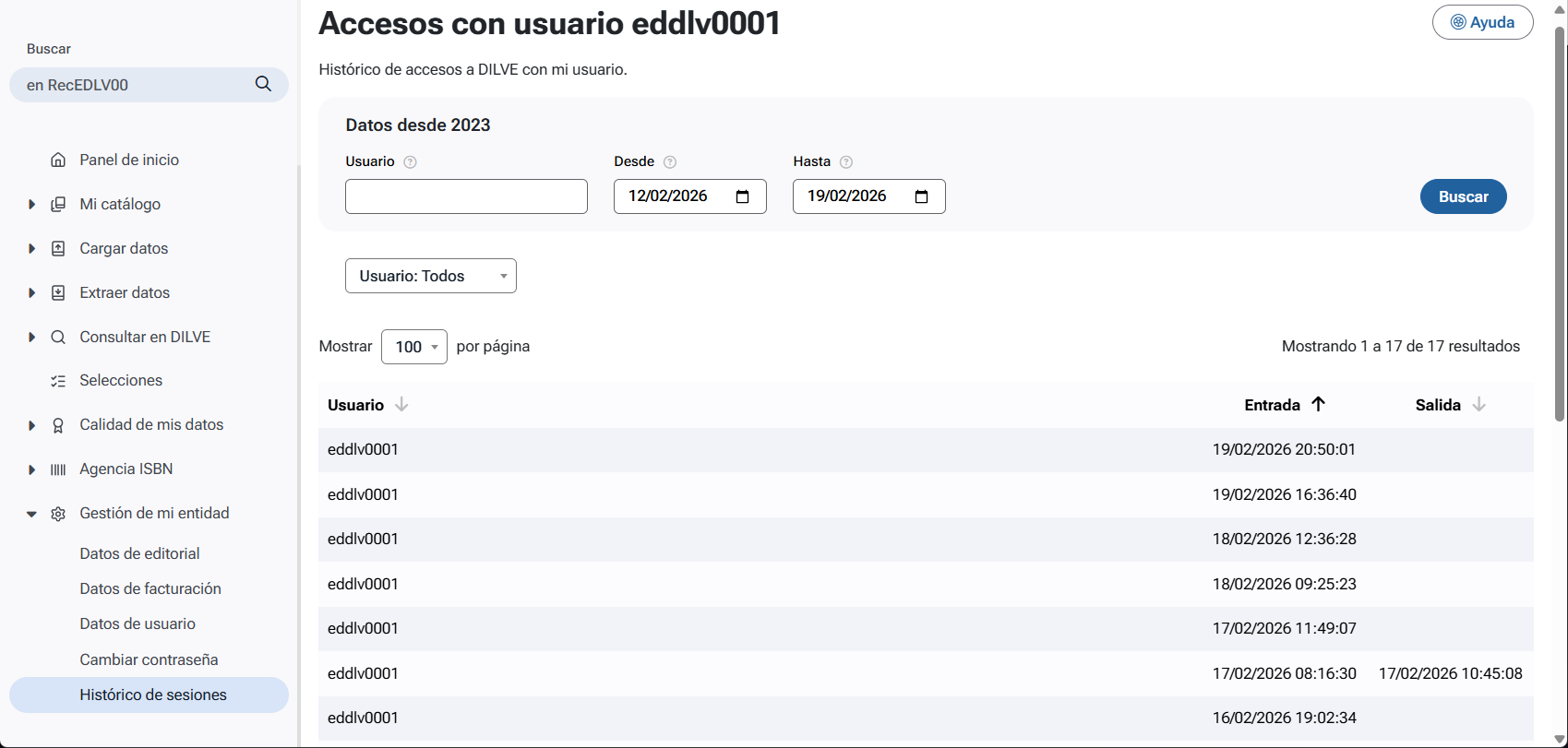 Muestra el historial de sesiones interactivas de los usuarios de la editorial o del grupo editorial, detallando las fechas y horas de acceso.