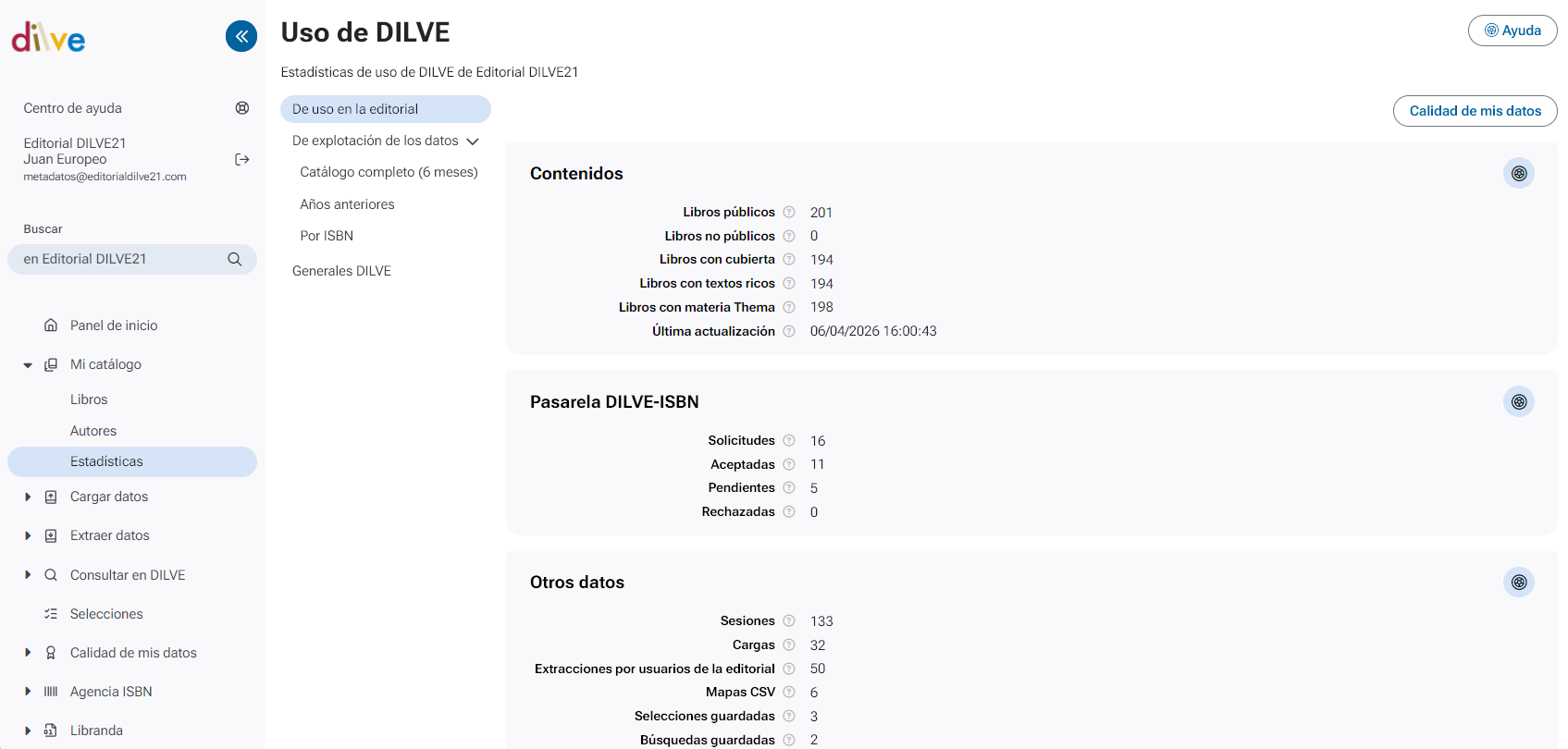 Entre otros datos, muestra el número de libros, tanto públicos como no públicos, de la editorial en DILVE. Y de esos libros, cuantos tienen imagen de cubierta, textos ricos y materias Thema asignadas.