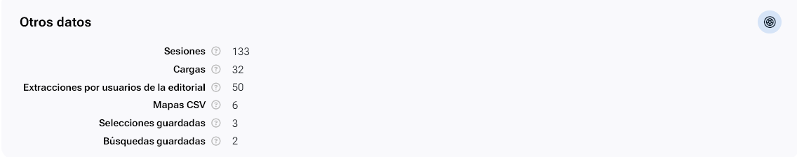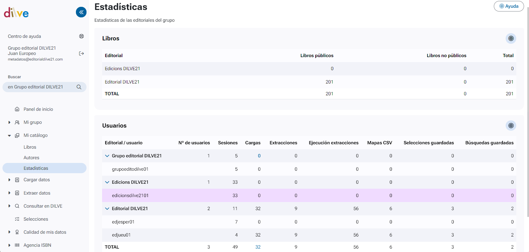 Muestra información sobre el uso de DILVE que han realizado los usuarios de la editorial: las veces que los usuarios han accedido a DILVE, el número de cargas realizadas, cuantas extracciones han ejecutado, cuantos mapas CSV tienen definidos, cuantas selecciones tienen guardadas o cuantas búsquedas han guardado.