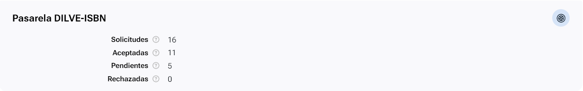 Muestra información sobre el uso de la pasarela DILVE-ISBN por parte de la editorial, como el número de solicitudes de registro de ISBN enviadas a la Agencia del ISBN, cuantas solicitudes ha aceptado la Agencia, cuantas están pendientes de respuesta o han sido rechazadas, etc.
