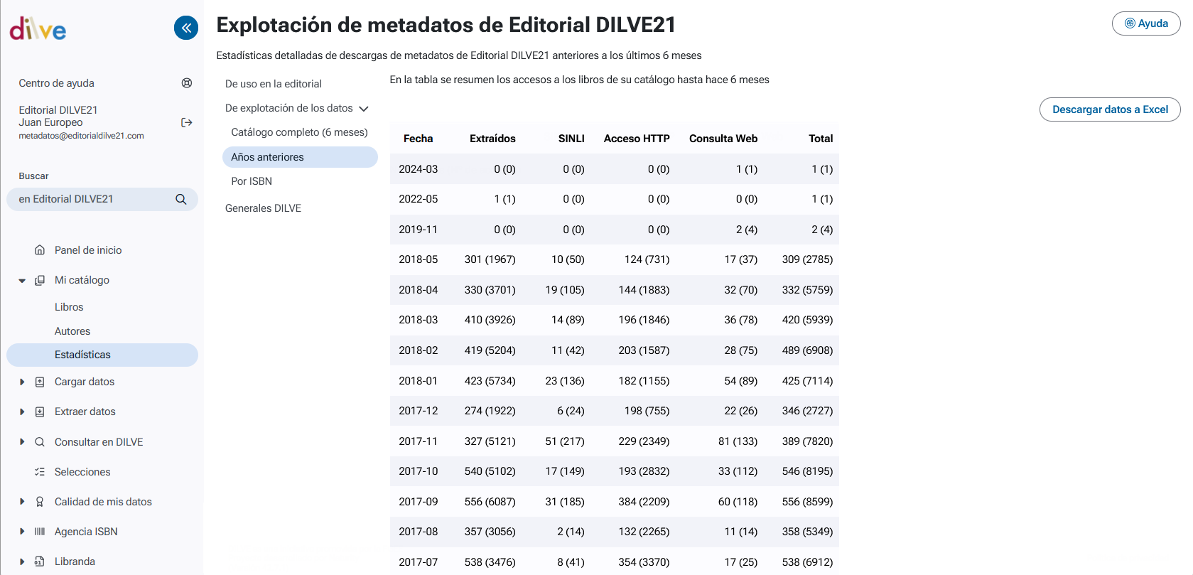 Se muestran los totales para cada mes y año según el método de extracción utilizado (extracciones en formato ONIX o CSV, extracciones en formato SINLI, llamadas HTTP a las funciones de la API de DILVE o consultas a través de la web de DILVE).