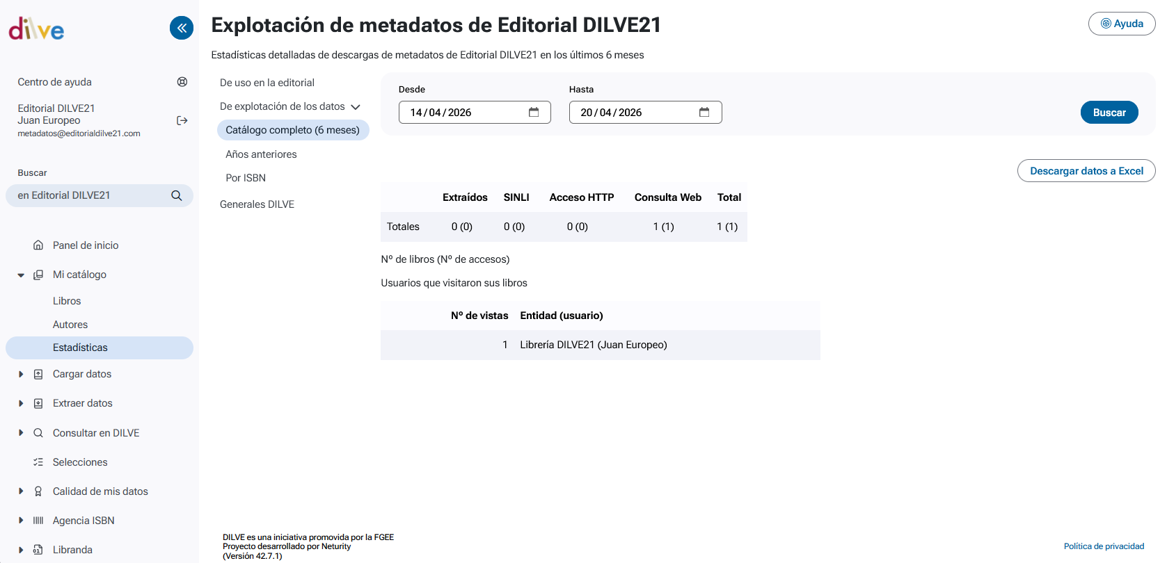 Permite consultar las estadísticas detalladas de descargas de metadatos de los libros de la editorial en los últimos 6 meses. Por defecto, se muestran los datos de la última semana.