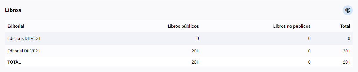 Permite consultar el número total de libros que tienen las editoriales del grupo editorial en DILVE, tanto públicos como no públicos.