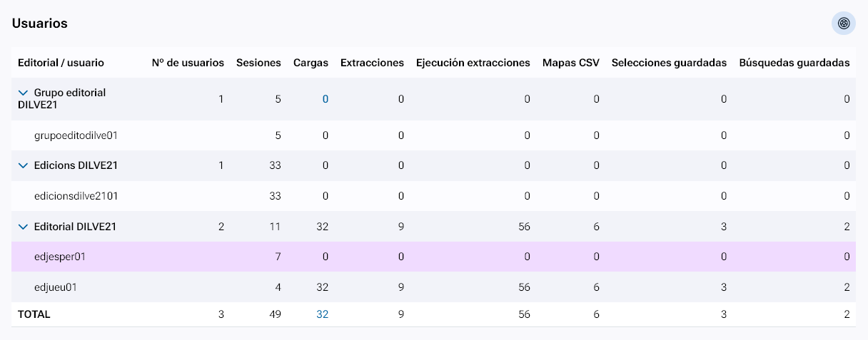 Muestra los usuarios que tienen definidos las editoriales del grupo editorial, junto un resumen de su actividad en DILVE: número de accesos a DILVE, número de cargas realizadas, número de extracciones definidas, número de extracciones ejecutadas, número de mapas CSV definidos, número de selecciones guardadas y número de búsquedas guardadas.