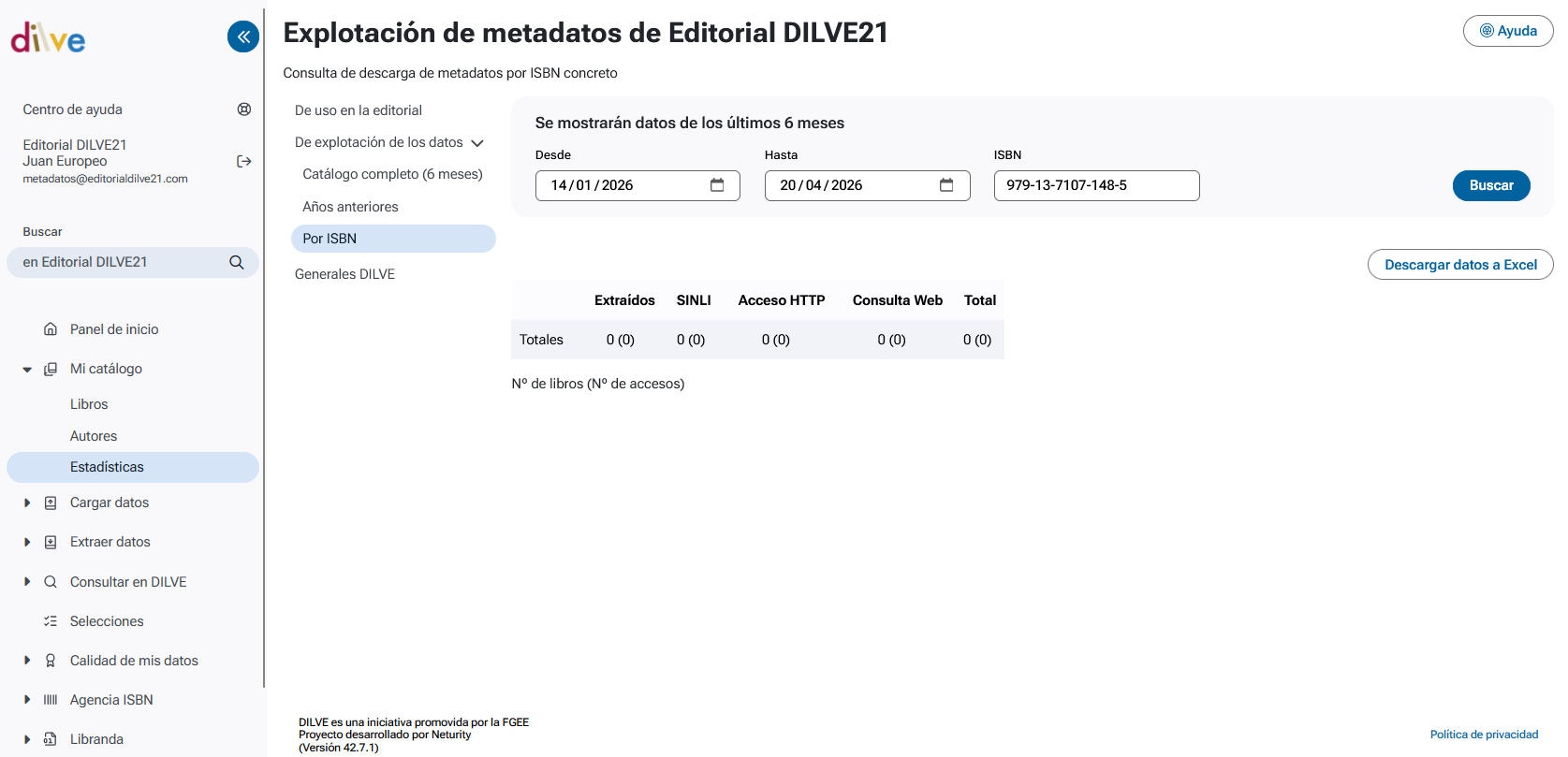 Permite consultar las estadísticas detalladas de descargas de metadatos de un libro concreto en los últimos 6 meses, identificándolo por su ISBN. Por defecto, se muestran los datos de la última semana.