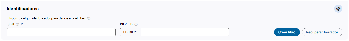 Para dar de alta a un libro nuevo, se debe introducir un identificador: un ISBN (con o sin guiones) o, excepcionalmente, un identificador interno DILVE ID. Solo se pueden hacer públicos los datos de libros que tengan un ISBN.