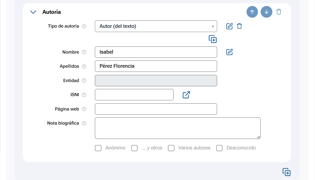 Esta funcionalidad es especialmente útil cuando no se dispone de toda la información necesaria en el momento de rellenar el formulario pero se quiere ir avanzando en el proceso de carga con otro libro, sin perder los campos ya completados.