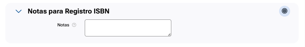 Esta información no se muestra a ningún otro usuario ni se incluye en las extracciones (salvo las de la propia editorial), por lo que no debe incluirse en este campo ningún dato que no sea estrictamente necesario para el proceso de registro del ISBN.