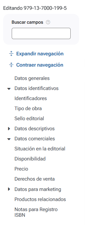Los campos del formulario se muestran agrupados en bloques y subbloques que se pueden plegar y desplegar, siguiendo una estructura similar a la del estándar ONIX.